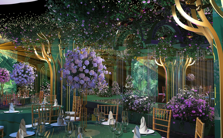色彩和主题:为婚礼堂设定一个主题和色彩方案,这样可以使整个空间更加统一和协调。例如,可以选择浪漫的粉色或蓝色,或者传统的红色或金色。